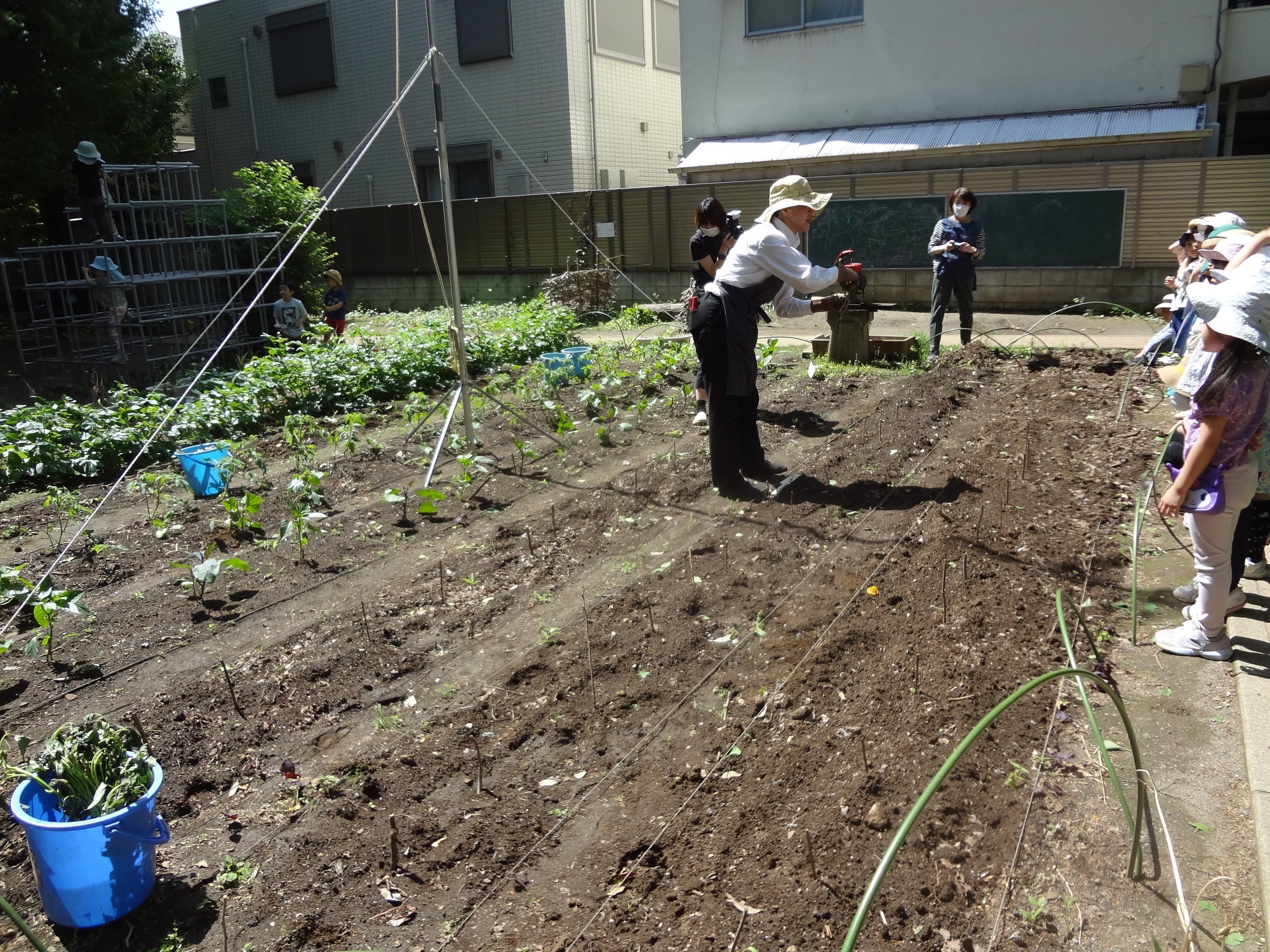 年長組がサツマイモの苗植えをしました。専門学校の園芸の先生がサツマイモの苗の説明をしてくれました。草苑幼稚園は、園庭に畑があるので園庭の畑でサツマイモを植えることが出来ます。